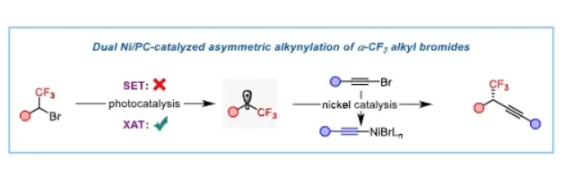 手性α-CF3炔烴化是一類非常重要的合成,CF3基團(tuán)的引入能夠極大改變分子的生物活性。炔基有豐富的官能團(tuán)轉(zhuǎn)化潛力,且可以作為“點擊化學(xué)”的把手,因此,炔烴化是快速構(gòu)建先導(dǎo)化合物庫的重要方式。三維立體結(jié)...