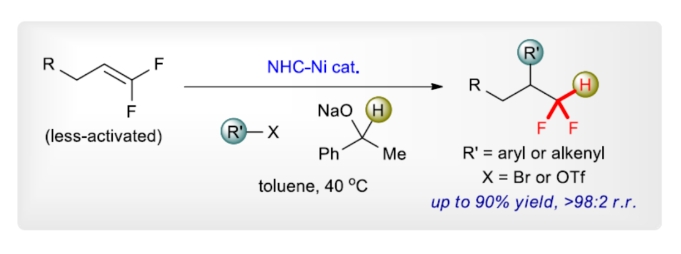 近日,新加坡國(guó)立大學(xué)Ming Joo Koh與美國(guó)德州農(nóng)工大學(xué)Osvaldo Gutierrez團(tuán)隊(duì)報(bào)道了一種鎳催化偕-二氟烯烴的1,2-選擇性氫芳基化和氫烯基化反應(yīng),合成了一系列具有二氟甲基取代碳中...