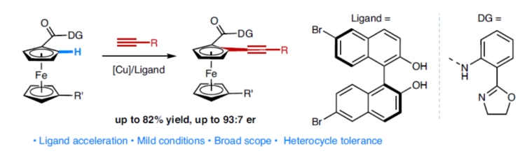 近日,美國斯克里普斯研究所余金權與上海有機所王鵬課題組利用一種修飾的手性BINOL配體,首次實現(xiàn)了銅介導二茂鐵的對映選擇性C-H炔基化反應,合成了一系列平面手性二茂鐵衍生物,具有高收率與高度的立體誘導...