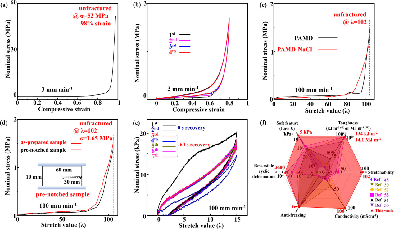 近日,四川大學譚帥、吉俊懿合作制備了一種兼具柔韌性、抗凍性的導電水凝膠。該水凝膠是通過在飽和高鹽溶液下使用由膠束穩(wěn)定的疏水性二乙烯基苯對丙烯酰胺進行均勻交聯(lián)一步制備的。作者研究了高鹽環(huán)境對水凝膠拓撲結...