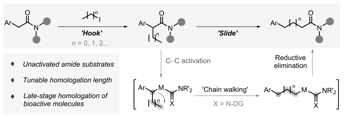 近日,美國芝加哥大學(xué)(University of Chicago)董廣彬課題組報道了一種“hook-and-slide”策略,實現(xiàn)了叔酰胺的可調(diào)控碳鏈長度的同系化反應(yīng)。此轉(zhuǎn)化在酰胺的α-位實現(xiàn)烷基化(...