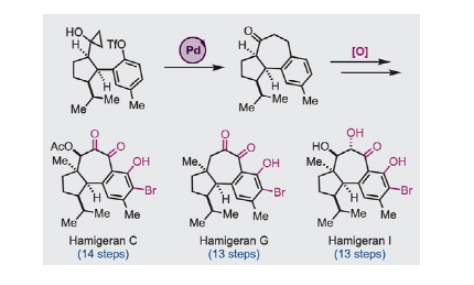 近日,代明驥教授(普渡大學(xué)Purdue University;埃默里大學(xué) Emory University)課題組實現(xiàn)了四種具有6?7?5三環(huán)骨架的hamigeran天然產(chǎn)物的全合成。關(guān)鍵策略包括:鈀...