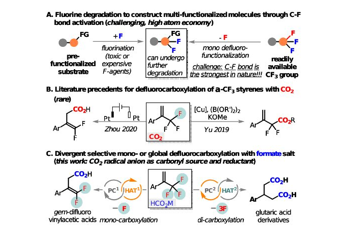 徐州醫(yī)科大學(xué)朱旭課題組:選擇性C-F鍵剪切策略實現(xiàn)α-三氟甲基苯乙烯與甲酸鹽的發(fā)散性脫氟羧基化反應(yīng)