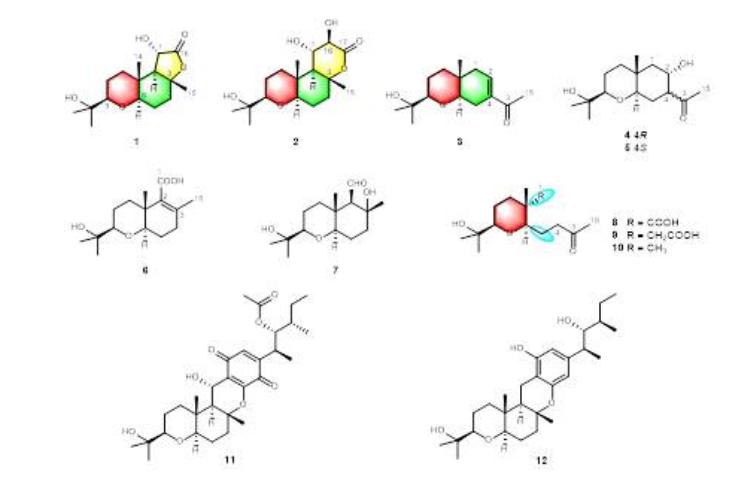 云南大學(xué)化學(xué)科學(xué)與工程學(xué)院丁中濤、蔡樂團(tuán)隊與大理大學(xué)王家鵬博士合作,從一株狗牙根平臍蠕孢 (B. cynodontis DJWT-01) 發(fā)酵物中分離得到10個新穎的含有2-(tetrahydro-2...