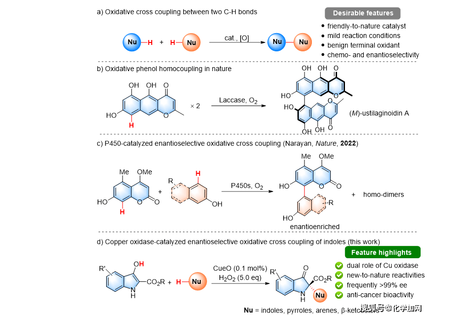 近日,華中科技大學(xué)鐘芳銳教授團隊報道了拓展銅酶雜泛性催化吲哚氧化交叉偶聯(lián)反應(yīng),合成了一系列光學(xué)純2,2-二取代吲哚啉-3-酮類化合物。相關(guān)研究成果發(fā)表在Angew. Chem. Int. Ed., 2...