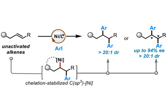 近日,南京師范大學(xué)陳良安課題組與南京林業(yè)大學(xué)宋亮亮報道了一種非活化烯烴的導(dǎo)向鎳催化還原1,2-二芳基化反應(yīng),具有優(yōu)秀的非對映選擇性。同時,通過手性配體的調(diào)控,一系列非活化末端和內(nèi)烯烴均可順利進行對映選...