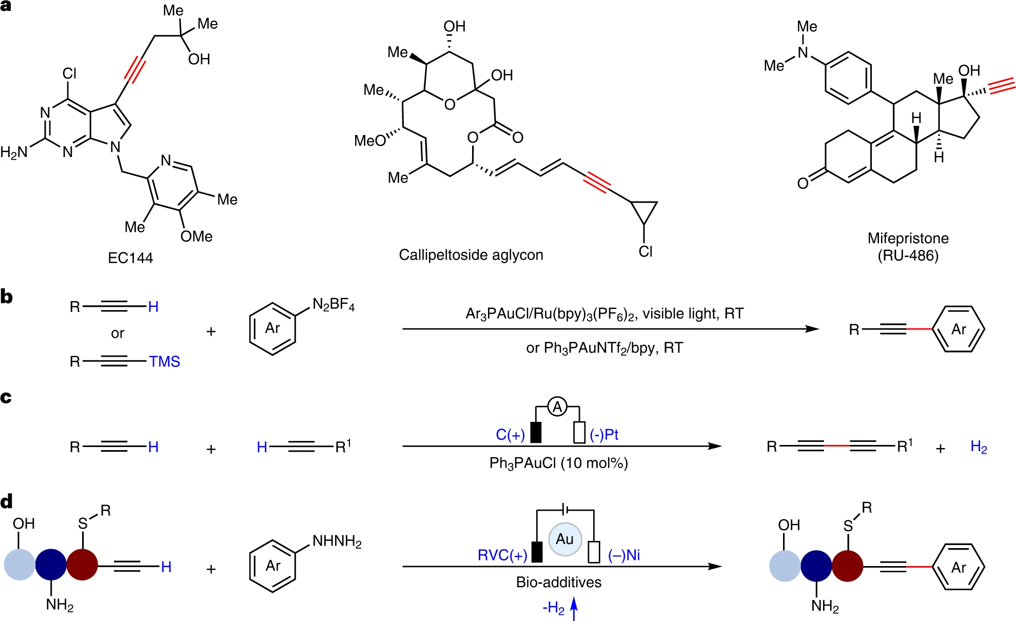 近日,南京大學(xué)的謝勁團(tuán)隊報道了一種溫和條件下,結(jié)合電氧化還原策略與雙核金催化實現(xiàn)的端炔與芳基肼C(sp2)-C(sp)偶聯(lián)反應(yīng),該反應(yīng)具有優(yōu)異的官能團(tuán)兼容性和生物相容性。他們以芳基肼為芳基自由基源,其...
