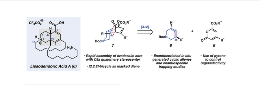 近日,美國加州大學(xué)洛杉磯分校(UCLA)Neil K. Garg課題組通過立體專一性對具有張力的環(huán)狀聯(lián)烯中間體進(jìn)行捕獲,通過12步實現(xiàn)了manzamine生物堿lissodendoric acid A...