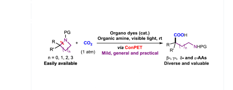 近日,四川大學(xué)余達(dá)剛與葉劍衡課題組通過連續(xù)光誘導(dǎo)電子轉(zhuǎn)移(ConPET)策略,實現(xiàn)了可見光催化CO2參與的環(huán)胺化合物C-N鍵羧基化反應(yīng)。同時,這也是氮雜環(huán)丁烷、吡咯烷和哌啶的首例光催化還原開環(huán)反應(yīng)。其...
