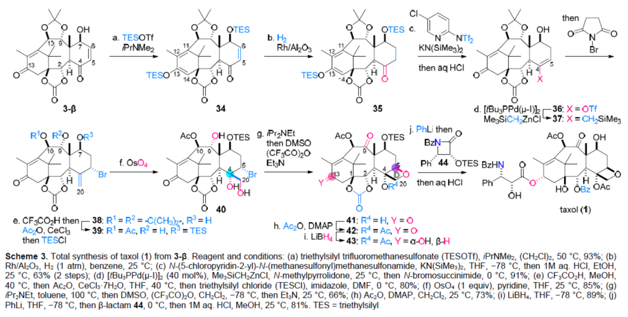 近日,東京大學(xué)Masayuki Inoue課題組報道了一種紫杉醇(Taxol)的全合成,共涉及34步反應(yīng)。其中,A-環(huán)和C-環(huán)片段通過分子間和分子內(nèi)自由基偶聯(lián)反應(yīng),實現(xiàn)了B-環(huán)的構(gòu)建。其次,通過使用新...