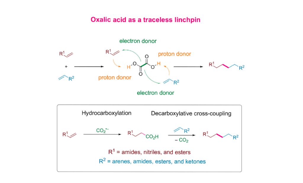 近日,新加坡國立大學(xué)(National University of Singapore)盧一新團(tuán)隊發(fā)展了雙光催化劑體系,利用草酸作為無痕linchpin,一鍋兩步(氫-羧基化和脫羧加成)實現(xiàn)了光催化下...