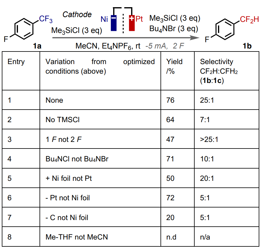 近日,英國布里斯托大學(xué)的Alastair Lennox教授課題組報道了一種Ar-CF3化合物電化學(xué)下可控的直接加氫脫氟反應(yīng)。他們利用電化學(xué)反應(yīng)的電極電勢可調(diào)性以及鎳陰極的選擇性,實現(xiàn)了Ar-CF3的深...