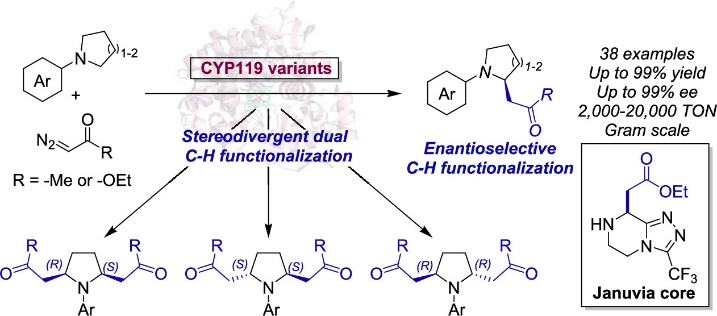 近日,美國羅徹斯特大學Rudi Fasan課題組報道了一種基于CYP119的生物酶催化劑,成功實現(xiàn)了吡咯烷等飽和氮雜環(huán)的對映選擇性a-C–H功能化,具有高收率、高對映選擇性和高催化活性等優(yōu)點,TON高...