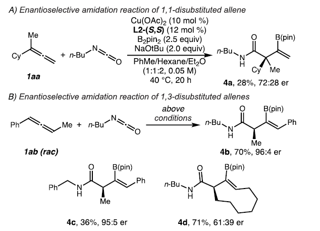 近日,美國西北大學Karl A. Scheidt課題組報道了一種銅催化合成具有α-立體中心β-硼基酰胺的方法。該方法利用烯丙基銅中間體與異氰酸酯的作用,高產(chǎn)率和高對映選擇性地獲得目標產(chǎn)物。DFT計算表...