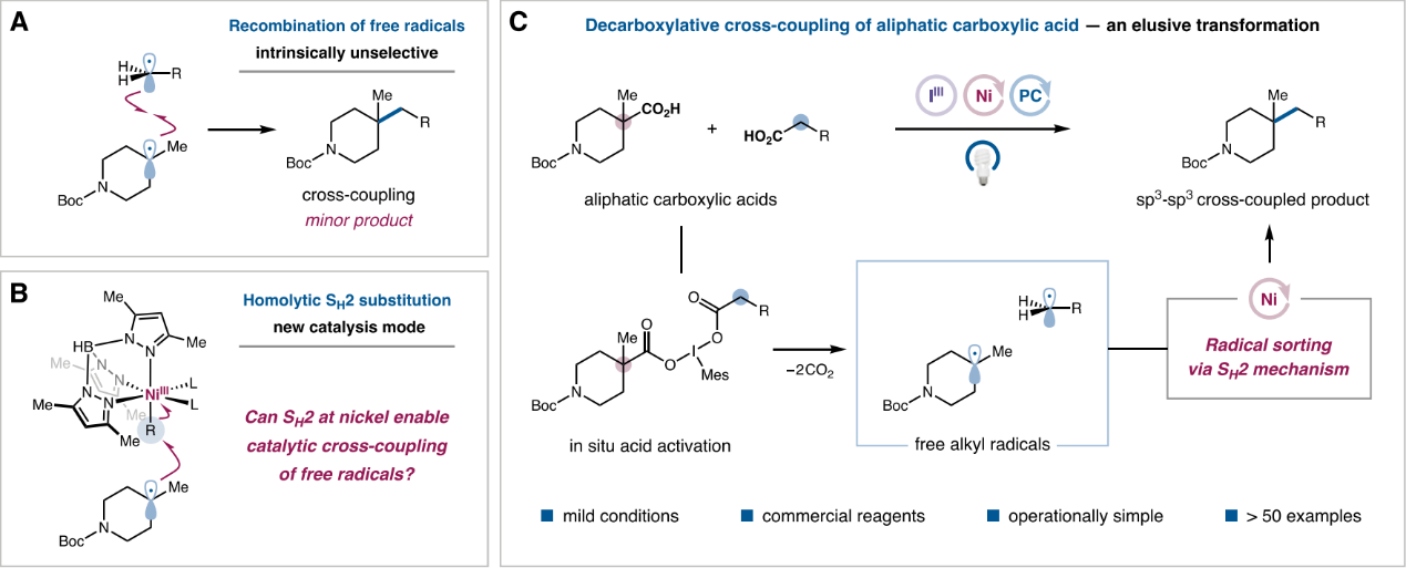 近日,2021年化學(xué)諾獎得主、美國普林斯頓大學(xué)的David W. C. MacMillan教授課題組首次報道了一種基于雙分子均裂取代(SH2)策略的光/鎳協(xié)同催化自由基型交叉脫羧偶聯(lián)反應(yīng),可用于由脂肪...