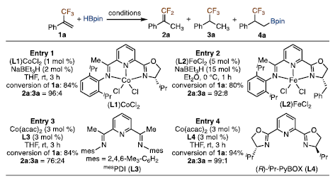 近日,新加坡國立大學葛少中課題組以Co(acac)2和雙膦配體為催化劑,發(fā)展了含氟烷基取代末端烯烴與HBpin的去氟硼化和不對稱硼氫化反應(yīng)。多種氟烷基取代末端烯烴可發(fā)生這種不對稱硼氫化反應(yīng)并高對映選擇...