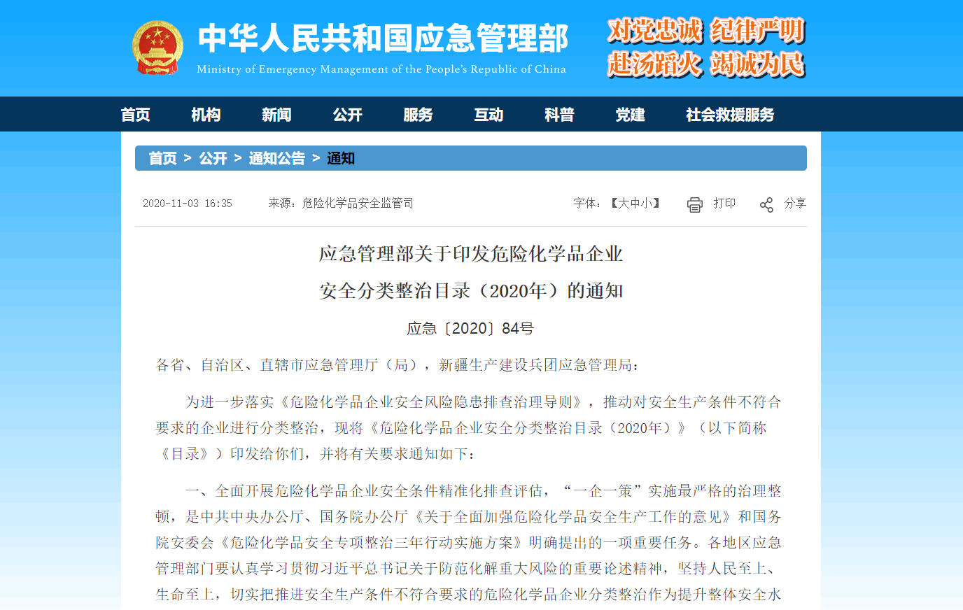 近日,應(yīng)急管理部印發(fā)危險(xiǎn)化學(xué)品企業(yè)安全分類整治目錄(2020年),...