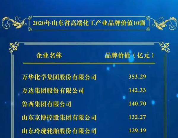 5月8日,山東省2020年“中國品牌日”活動在煙臺舉辦,會上評選出“2020年山東省高端化工產(chǎn)業(yè)品牌價值10強”,萬華化學(xué)集團(tuán)股份有限公司以353.29億元的品牌價值位列榜首,萬達(dá)集團(tuán)股份有限公司、...