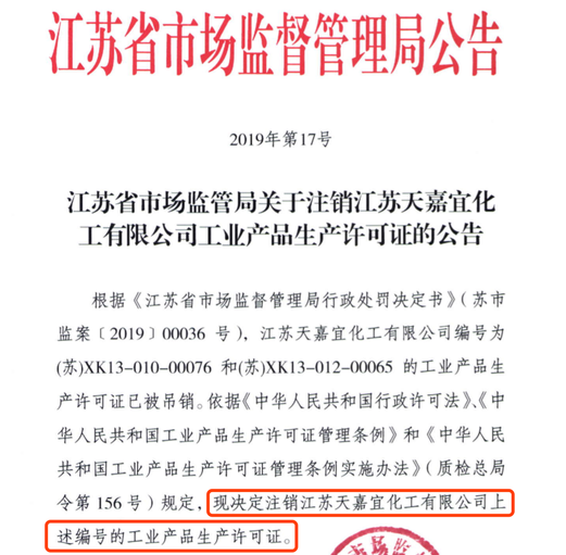 今日(1月7日)下午,江蘇省市場(chǎng)監(jiān)督管理局一名工作人員向新京報(bào)記者證實(shí),因涉特別重大爆炸事故,江蘇響水天嘉宜化工有限公司(以下簡(jiǎn)稱“天嘉宜化工”)已被吊銷許可證,目前正處于公示期。2019年3月21日...
