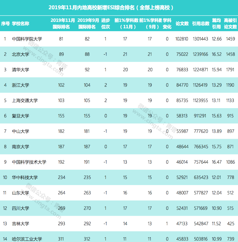 11月15日,ESI數據庫更新了2019年11月最新ESI數據,這也是2019年最后一期的ESI數據。據統(tǒng)計,全球共有6214家科研機構上榜。本期青塔整理了2019年11月ESI最新數據中國內地高校綜...