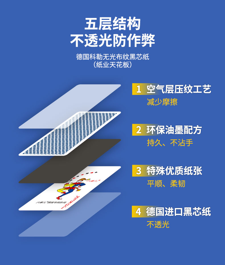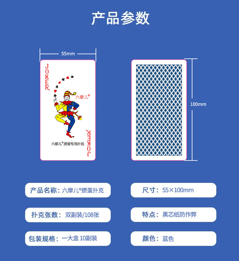 非工作時間適當?shù)膴蕵贩潘?,是為了工作時間可以更好地專注于工作!歡迎體驗我們的“名牌”——六摩兒?摜蛋比賽專用高端撲克!完全不一樣的手感,不一樣的紙質(zhì)!55*100mm創(chuàng)新尺寸,握牌更舒服。采用德國進口天花板級黑芯紙,空氣層壓紋工藝,環(huán)保油墨配方,平順柔韌不透光,清晰順滑耐用。