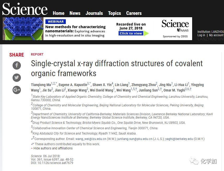此項研究不僅突破了共價有機框架材料領域發(fā)展的長期瓶頸,也為動態(tài)共價化學的理論和應用研究提供了全新的實例。原文鏈接請參見http://science.sciencemag.org/content/361/6397/48.full。我校馬天瓊博士為文章的第一作者,王為教授、北京大學孫俊良研究員和加州大學伯克利分校Omar Yaghi教授為文章的共同通訊作者,蘭州大學為第一通訊單位。