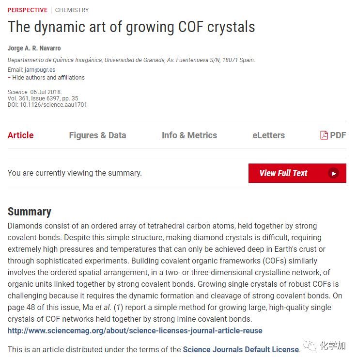 西班牙德格拉納達大學Jorge A. R. Navarro教授以“生長COF晶體的動態(tài)藝術”(“The dynamic art of growing COF crystals”)為題,對該工作進行了同期評述,參見http://science.sciencemag.org/content/361/6397/35。