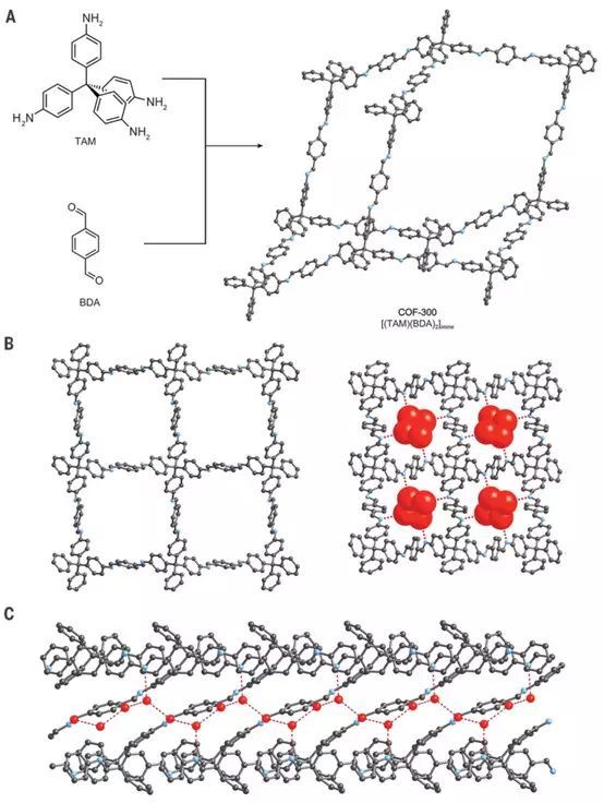 圖2. COF-300及含有客體水分子的COF-300的單晶XRD數(shù)據(jù)