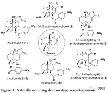 Insulicolide A(1)是一種稀有的硝基苯甲?;〈谋栋胼祁惢衔铮?/span>2-6, Figure 1),于1997年從海洋真菌Aspergillus insulicola中分離得到(J. Nat. Prod. 1997, 60, 811.),其結(jié)構(gòu)通過X射線晶體學(xué)分析確證,該化合物具有獨特的drimane型骨架,并且含有五個連續(xù)的立體中心,其中兩個是四級碳(C-4和C-10)。Insulicolide A(1)對10種人癌細(xì)胞系(H1975,U937,K562,BGC-823,Molt-4,MCF-7,A549,Hela,HL60和Huh-7)均具有顯著的細(xì)胞毒性,IC50值:2.11~6.35 μM。