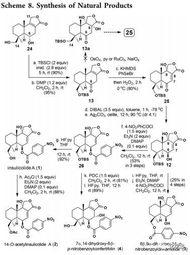 在得到內(nèi)酯24后,作者將目標(biāo)轉(zhuǎn)向天然產(chǎn)物的全合成,首先需要分別在C-6和C-9立體選擇性引入兩個羥基。將24中的伯醇用TBS選擇性保護(hù),仲醇用DMP氧化成相應(yīng)的酮13。作者首先嘗試了通過雙羥化-脫水反應(yīng)在25中引入C-9羥基,但13未發(fā)生雙羥化。隨后,作者探索了基于硒氧化物的[2,3]-σ遷移重排來合成25,即酮13經(jīng)KHMDS處理后與PhSeBr反應(yīng)得到的硒代苯基酮和H2O2反應(yīng)生成硒氧化物,再進(jìn)行[2,3]-σ遷移重排得到25。經(jīng)DIBAL-H還原將酮和內(nèi)酯部分還原為相應(yīng)的醇和半縮醛,然后進(jìn)行Fetizon氧化得到12(主要異構(gòu)體)及其非對映異構(gòu)體的混合物,不經(jīng)分離直接進(jìn)行苯甲酰化得到26(53%)及其非對映異構(gòu)體(13%)。將26脫去TBS便得到insulicolide A(1);將1乙?;玫?/span>14-O-acetylinsulicolide A(2);將底物12(作為一對C-6非對映異構(gòu)體)脫TBS產(chǎn)生的三醇與4-NO2-PhCOCl反應(yīng)以25%的收率得到6β,9α-dihydroxy-14-p-nitrobenzoyl-cinnamolide(3);在PDC的存在下,底物26發(fā)生1, 3-羥基遷移,所得產(chǎn)物脫TBS后以89%的收率得到7α,14-dihydroxy-6β-p-nitrobenzoylconfertifolin(4)。