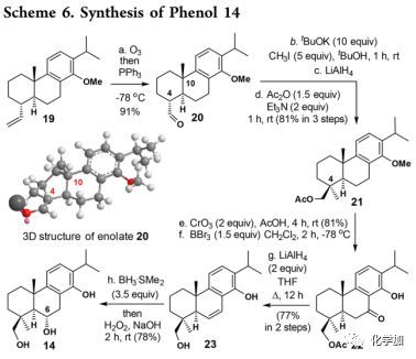 化合物19經(jīng)化學(xué)選擇性臭氧分解得到的臭氧化物用Ph3P還原得到醛20,通過用t-BuOK/t-BuOH處理醛20來引入C-4季碳手性中心,并且將得到的烯醇化物與MeI反應(yīng),然后經(jīng)LiAlH4還原和Ac2O乙?;玫揭宜狨?/span>21。隨后,經(jīng)CrO3氧化、BBr3脫甲基得到酮22,然后用LiAlH4在THF中回流下處理22酮基經(jīng)串聯(lián)還原得到23。最后,通過硼氫化氧化實現(xiàn)區(qū)域和非對映選擇性引入C-6羥基得到苯酚14(78%)。