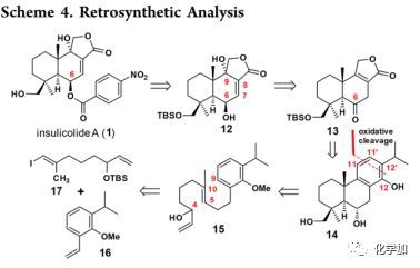 Insulicolide A(1)可由二醇12經(jīng)C-6羥基的苯甲酰化和脫TBS來合成,而12可以由內(nèi)酯13通過其雙鍵與H2O2/NaOH的環(huán)氧化以及堿介導(dǎo)的環(huán)氧開環(huán),或者雙鍵的雙羥化以及新生成的C-8羥基脫水來構(gòu)建。內(nèi)酯13可通過苯酚14在C-11/C-11'和C-12/C-12'處進(jìn)行C-C鍵的區(qū)域選擇性氧化裂解產(chǎn)生,苯酚14則可以通過銥催化的對映選擇性多烯環(huán)化串聯(lián)反應(yīng)從外消旋的烯丙基醇15合成,而15可以通過乙烯基碘17與取代苯乙烯16進(jìn)行Suzuki偶聯(lián)獲得。