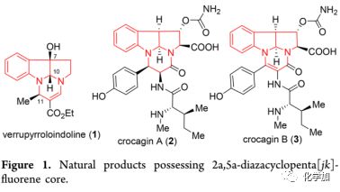 海洋生物如藻類、海綿和珊瑚等一直是人類發(fā)現(xiàn)具有藥理活性化合物以及尋找新型藥物的豐富來(lái)源。然而,從海洋中分離提取天然產(chǎn)物極具挑戰(zhàn)性,并且獲得的量極少,極大地阻礙了相關(guān)藥物的開(kāi)發(fā)研究。在這種情況下,化學(xué)全合成便成為獲取海洋天然產(chǎn)物的重要工具。 Verrupyrroloindoline(1)是由嚴(yán)鵬程、Gustafson及其同事于2016年從中國(guó)南海軟珊瑚Sinularia verruca中分離得到的一種吡咯并二氫吲哚類生物堿(Figure 1)。該化合物7S*,10S*,11S*的相對(duì)構(gòu)型是通過(guò)NOESY確定的,旋光為{[α]D25= -22(c=0.06,CHCl3)},但其絕對(duì)構(gòu)型尚未確定。其結(jié)構(gòu)特征在于含有吡咯并二氫吲哚單元和烯胺基部分的2a,5a-二氮雜環(huán)戊烷[jk]芴母核,是一種罕見(jiàn)的天然生物堿類,后續(xù)Müller及其同事也報(bào)道了具有相似骨架的生物堿[crocagins A(2), B(3)]。