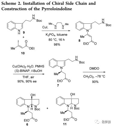 首先,將N-Boc保護(hù)的色胺9與β-碘烯醇化物10進(jìn)行Buchwald偶聯(lián)以89%的產(chǎn)率得到化合物8,若將該反應(yīng)溫度升至80 ℃并反應(yīng)16小時(shí),產(chǎn)率可提高至98%。按照Buchwald報(bào)道的催化不對(duì)稱氫化銅還原操作將8進(jìn)行共軛還原以90%的產(chǎn)率(90%,ee)得到7。然后利用二甲基過(guò)氧化酮(DMDO)引發(fā)的氧化環(huán)化策略構(gòu)建吡咯并-[2,3-b]吲哚環(huán),即在丙酮中用DMDO處理7以90%的產(chǎn)率得到兩種不可分離的非對(duì)映異構(gòu)體6和11,由于C-N酰胺鍵旋轉(zhuǎn)受限,未能通過(guò)核磁確定二者的比率。