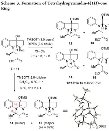 接下來(lái),由于未能成功用TFA實(shí)現(xiàn)脫Boc,所以設(shè)想了一種替代方法:N-Boc裂解,嘧啶環(huán)形成和羥基的TMS保護(hù)(Scheme 3)。首先嘗試加大DIPEA用量(145當(dāng)量)利用TMSOTf/DIPEA進(jìn)行反應(yīng)的實(shí)驗(yàn)以失敗告終;當(dāng)將DIPEA的量減少至3.0當(dāng)量時(shí),以80%的產(chǎn)率得到四種異構(gòu)體12-15(45:20:7:28)。為了促進(jìn)環(huán)化過(guò)程,作者嘗試了更強(qiáng)的堿,用TMSOTf/2,6-lutidine處理6和11的非對(duì)映異構(gòu)體混合物以60%的產(chǎn)率得到兩種可分離的非對(duì)映異構(gòu)體12和14(dr = 2.4:1)。通過(guò)X射線衍射確定主要異構(gòu)體12的絕對(duì)構(gòu)型和立體化學(xué)為7R,10S,11R。結(jié)果表明在(S)-BINAP存在下,利用Buchwald的催化不對(duì)稱氫化銅還原處理8可產(chǎn)生R-構(gòu)型[(R)-7]。同時(shí)還揭示了verrupyrroloindoline(1)中14-Me,H10,7-OTMS之間的順聯(lián)關(guān)系。中間體14中14-Me,H10/7-OTMS的相對(duì)構(gòu)型通過(guò)NOESY確證,并可以推導(dǎo)出次要異構(gòu)體14的絕對(duì)構(gòu)型(7S,10R,11R)。