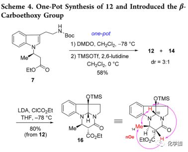 為了提高合成效率,作者設(shè)想了 “一鍋法”的合成方法,包括氧化環(huán)化,N-Boc裂解,再次環(huán)化和TMS保護(hù)(Scheme 4)。將化合物7用DMDO在-78 ℃下處理30分鐘,然后真空濃縮,并在0 ℃下向所得混合物中加入TMSOTf/2,6-lutidine反應(yīng)1 h,以58%的收率得到12和14的混合物(dr, 3:1)。然后通過(guò)LDA去質(zhì)子化形成烯醇化物與氯甲酸乙酯反應(yīng)引入C12位乙氧羰基得到16(80%),作為單一非對(duì)映異構(gòu)體,通過(guò)NOESY效應(yīng)判定11,12-反式結(jié)構(gòu)。