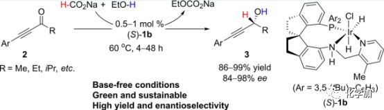 最近,作者發(fā)現(xiàn)其開發(fā)的手性銥催化劑IrSpiroPAP(1)與螺吡啶-氨基膦三齒配體對(duì)于簡(jiǎn)單酮的不對(duì)稱轉(zhuǎn)移氫化是非常有效的。利用乙醇作為氫供體和t-BuOK作為堿可以將一系列烷基芳基酮還原成相應(yīng)的手性醇,并且具有良好的對(duì)映選擇性。由于乙醇可再生且對(duì)環(huán)境友好,作者嘗試?yán)眠@種催化體系還原炔基酮。結(jié)果發(fā)現(xiàn)手性螺環(huán)銥催化劑對(duì)于在甲酸鈉/乙醇作為氫供體對(duì)炔基酮的不對(duì)稱轉(zhuǎn)移氫化是有效的,且不需添加任何堿(Scheme 1)。