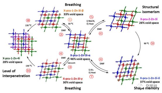 圖2. 金屬-有機(jī)材料X-pcu-1-Zn-3i-α的6種物相及其相互轉(zhuǎn)化過程與表現(xiàn)出的4種類型的刺激響應(yīng)行為的示意圖。