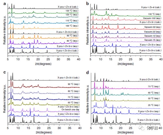 圖3. 原位變溫粉末衍射圖:表征金屬-有機(jī)材料X-pcu-1-Zn-3i-α受相關(guān)外界刺激發(fā)生響應(yīng)的過程。