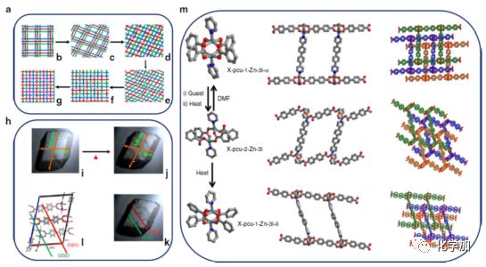 圖5. a)X-pcu-1-Zn-3i-α轉(zhuǎn)變成X-pcu-1-Zn-4i的機(jī)理推斷示意圖;h)X-pcu-1-Zn-3i-α的光學(xué)熱顯微鏡圖;m)X-pcu-1-Zn-3i-α、X-pcu-2-Zn-3i和X-pcu-1-Zn-3i-δ之間轉(zhuǎn)化過程中金屬節(jié)點異構(gòu)化的示意圖。
