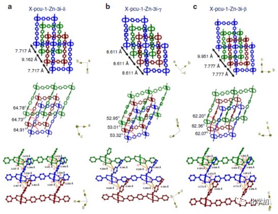 圖4. X-pcu-1-Zn-3i-δ、X-pcu-1-Zn-3i-γ和X-pcu-1-Zn-3i-β的局部單晶結(jié)構(gòu)圖。