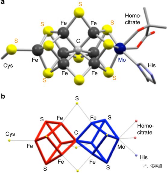 圖1. 固氮酶中鐵鉬輔因子的結構示意圖:a)靜態(tài)結構圖;b)鐵鉬輔因子的無機結構部分的線框示意圖。