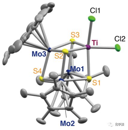 ②晶體結構顯示[Mo3S4Ti]簇合物2中,鈦原子呈現近四方錐配位模式,S3硫原子則處于四方錐的頂點(如圖3顯示的S3原子)。其中Ti-S3的鍵長都短于Ti-S1和Ti-S2的鍵長;Ti–Cl鍵長則跟常見的Ti(III)–(Cl)3配合物中的Ti-Cl鍵長接近。