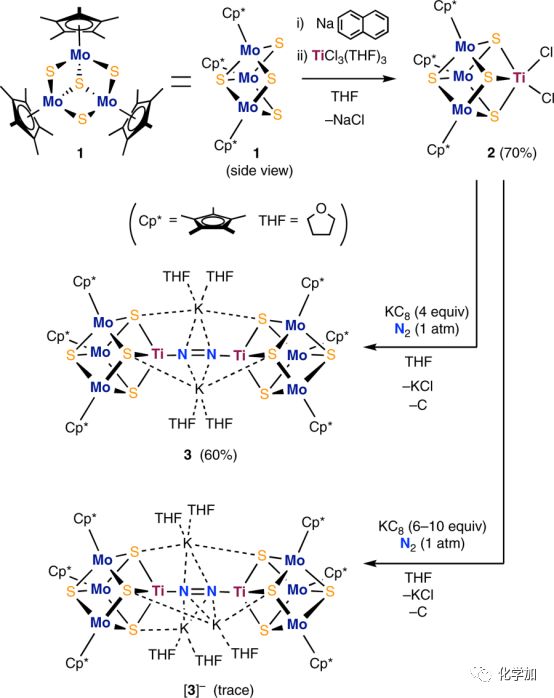 立方體[Mo3S4Ti]簇合物2和結合N2的簇合物3的合成與表征。