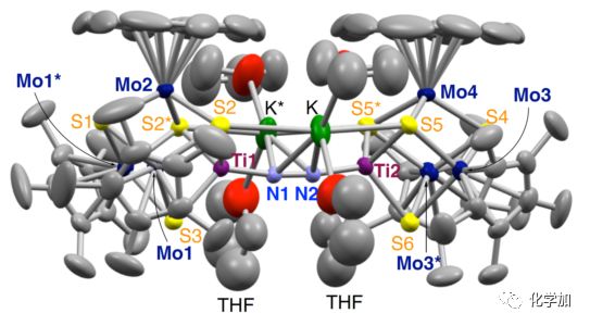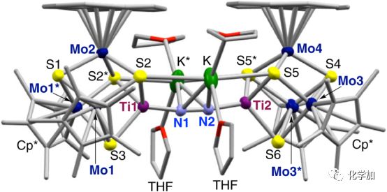 圖5. 簇合物3,[K(THF)2]2[Cp*3Mo3S4Ti]2(μ-N2),的晶體結構圖。