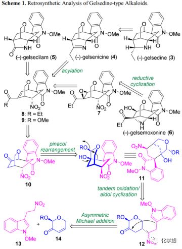 從結(jié)構(gòu)上看,gelsedine型生物堿具有共同的氧雜雙環(huán)[3.2.2]壬烷核心和螺-N-甲氧基吲哚酮部分,以及嵌入緊湊骨架中的多種官能化雜環(huán)(如吡咯烷,吡咯啉,吡咯烷酮或氮雜環(huán)丁烷環(huán))(3-6; 圖1)。逆合成分析如圖2所示:作者設(shè)想該天然產(chǎn)物的合成多樣性可以由四環(huán)硝基化合物8或9經(jīng)后期雜環(huán)化過(guò)程實(shí)現(xiàn)。具體而言,gelsemoxonine(6)可以由環(huán)氧化物7經(jīng)過(guò)仿生環(huán)化衍生而來(lái)。同時(shí),吡咯烷和吡咯啉有望通過(guò)乙酮8的分子內(nèi)縮合和還原得到。同樣,5中的吡咯烷酮核心骨架可以通過(guò)酯9中的硝基和烯烴的還原,以及隨后的內(nèi)酰胺化構(gòu)建?;衔?strong style="box-sizing: border-box;">8或9可能來(lái)自中間體10中酮α位上的?;?,和隨后的一系列官能團(tuán)轉(zhuǎn)化。10的氧雜雙環(huán)[3.2.2]壬烷骨架可以由簡(jiǎn)化的氧雜二環(huán)[3.3.1]壬烷11經(jīng)氧鎓離子誘導(dǎo)的頻哪醇重排構(gòu)建。11中吲哚酮部分的季碳手性中心可以經(jīng)三環(huán)12的串聯(lián)氧化/羥醛環(huán)化形成,其可由簡(jiǎn)單底物13和14經(jīng)Michael加成得到。