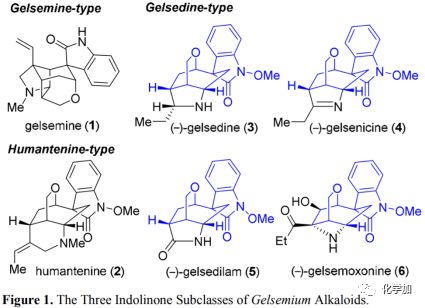 Gelsemium屬植物在傳統(tǒng)的亞洲醫(yī)學(xué)中已被廣泛用于治療皮膚潰瘍、皮炎等各種疾病。目前,科研人員已從Gelsemium植物中分離出一系列結(jié)構(gòu)多樣的生物堿,其中一些生物堿具有良好的生物活性,包括鎮(zhèn)痛、抗炎和免疫調(diào)節(jié)以及強(qiáng)效抗腫瘤活性。在已知的五種類別的Gelsemium生物堿中,有三個(gè)亞家族具有共同的螺-吲哚啉酮骨架,即gelsemine型、humantenine型和gelsedine型生物堿(圖1)。Gelsemium生物堿展示出的生物活性及其密集的多環(huán)結(jié)構(gòu)已受到合成界的廣泛關(guān)注。值得注意的是,盡管已有多種gelsemine的合成方法,但gelsedine型生物堿所受關(guān)注較少,迄今為止只有少數(shù)半合成和全合成的報(bào)道。