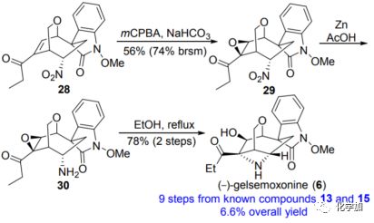 最后,作者將此發(fā)散合成策略拓展到(–)-gelsemoxonine(6)的全合成上。從關(guān)鍵中間體28開(kāi)始,m-CPBA促使28進(jìn)行立體選擇性環(huán)氧化產(chǎn)生環(huán)氧化物29,產(chǎn)率為56%。隨后用鋅粉和乙酸還原硝基,然后進(jìn)行仿生環(huán)化,得到(-)-gelsemoxonine(6),兩步產(chǎn)率為78%。