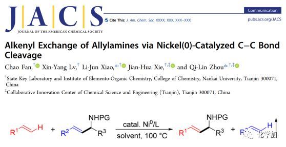 最近,南開大學(xué)周其林院士團(tuán)隊(duì)開發(fā)了一種通過Ni(0)-催化的亞胺加氫烯化合成烯丙胺的方法,該反應(yīng)的可逆性表明烯丙胺的鏈烯基可以與另一種烯烴交換以產(chǎn)生新的烯丙胺。在該烯基交換反應(yīng)中,烯丙胺底物、烯丙胺產(chǎn)物和兩種烯烴均處于平衡狀態(tài);如果產(chǎn)生的烯烴可以從反應(yīng)體系中揮發(fā)出去,則平衡將向有利于形成新烯丙胺的方向移動(dòng)(Scheme 1b)。近日,周其林院士團(tuán)隊(duì)報(bào)道了通過Ni(0)-催化的C-C鍵裂解實(shí)現(xiàn)了烯丙胺和烯烴之間的烯基交換,為制備烯丙胺提供了新途徑。
