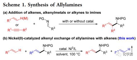 官能團(tuán)交換如酯交換和烯烴復(fù)分解反應(yīng)等可以用于引入或脫除官能團(tuán)從而制備傳統(tǒng)方法難以合成的復(fù)雜分子,為有機(jī)合成開辟了新的途徑。過渡金屬催化的選擇性裂解和C-C鍵生成是現(xiàn)代有機(jī)合成中的基本轉(zhuǎn)化,其中涉及的催化轉(zhuǎn)移官能化也可視為基團(tuán)交換反應(yīng),但兩個(gè)交換的官能團(tuán)彼此不同。烯丙胺是廣泛用于合成化學(xué)品、藥物和農(nóng)用化學(xué)品的多功能結(jié)構(gòu)單元,通常利用烯烴或其等價(jià)物與亞胺加成來得到(Scheme 1a)。然而,亞胺穩(wěn)定性通常較差、且易發(fā)生亞胺-烯胺互變異構(gòu)、分解和自縮合,限制了其用于合成烯丙胺的應(yīng)用。
